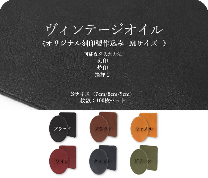 【Sサイズ(7・8・9cm)/2枚重ね裏面床革/刻印系名入れあり/100枚セット<オリジナル刻印制作込み Mサイズ>】の商品です。